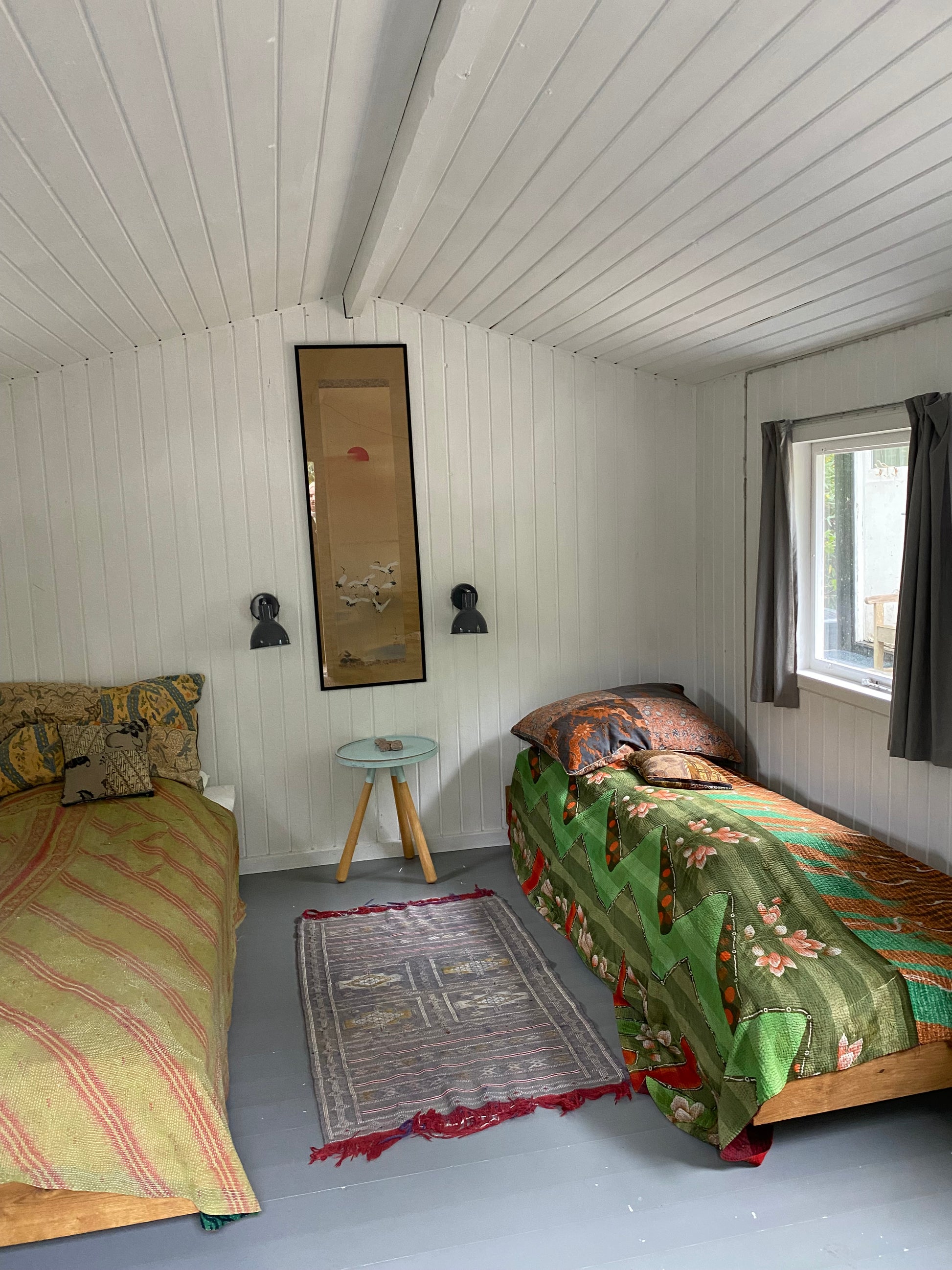 Vi bor i små, varme hytter med to enkeltsenge. Hytterne er isolerede og har elvarme. Toilet og bad findes få meter væk i hovedhuset. Sengene er 90 x 200 cm.